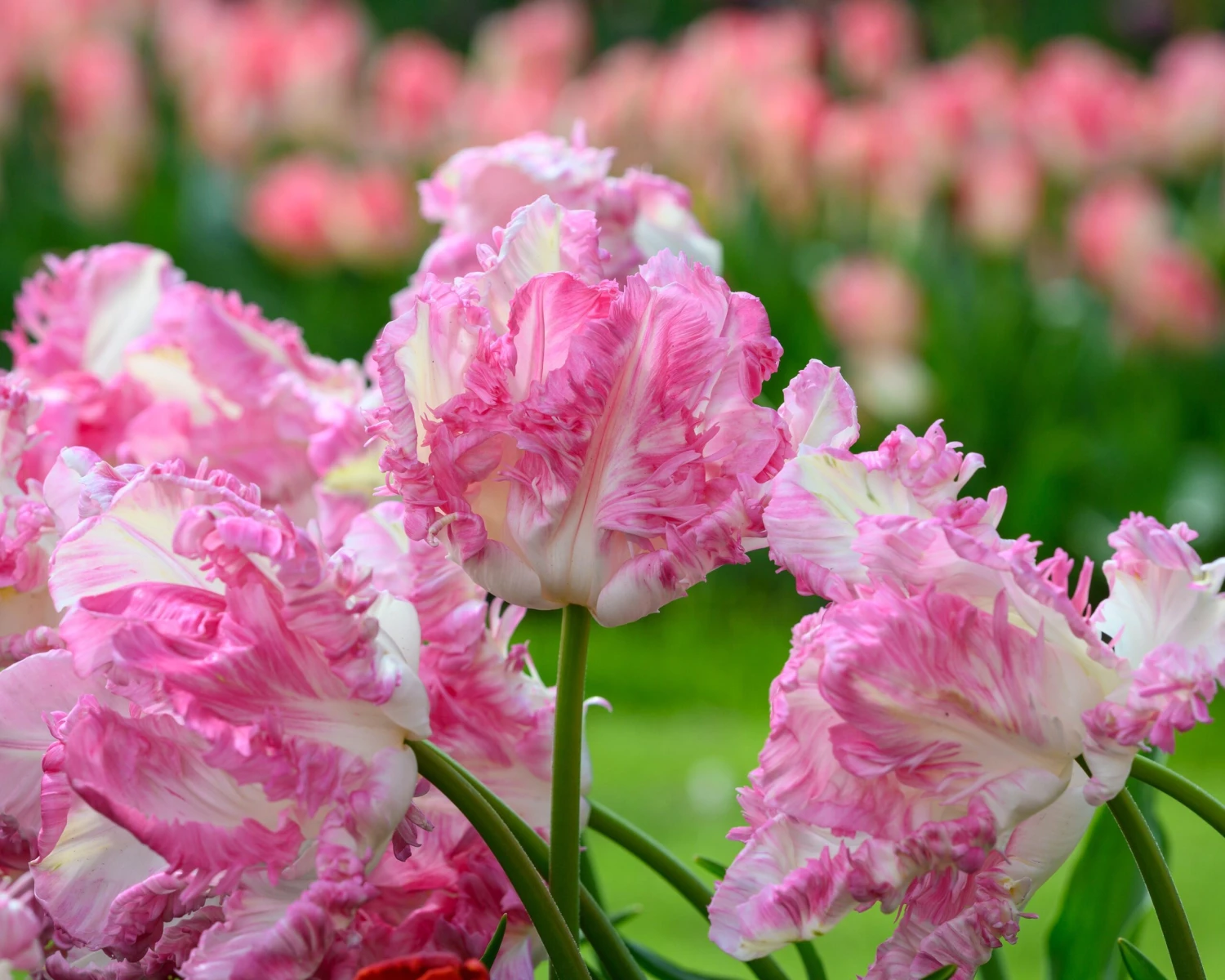 Parrot tulips are treasured for their twisted, curving petals that curl like yoga-masters into the most alluring shapes. Famed for their extravagant, ruffled petals, the over-sized flower heads make an impressive statement in late spring. The creamy-white petals of Tulip ‘Cabanna’ are infused apple-green which gradually colours through sugared-almond shades of soft pink. As each bloom reaches its peak, the feathered markings deepen to bright fuchsia. When planted in generous group, the lavish Tulip ‘Cabanna’ creates a frilly embroidery of undulating petals in the softest shades.