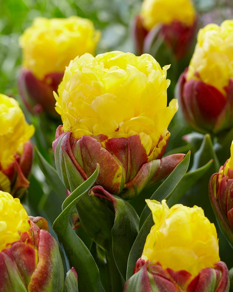 Sweeten up your spring with this decadent delight! Petal-packed Tulip ‘Ice Cream Banana’ opens into a luxurious, silky stack of sunny banana yellow ruffled layers giving an overall appearance of a generous dollop of banana ice cream, held in a green and pink cup as if it’s been topped a fruity drizzle of raspberry and lime. Of course, not actually edible, but this feast for the eyes certainly does look delicious!